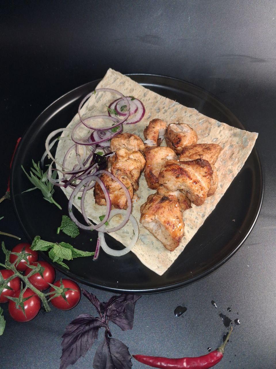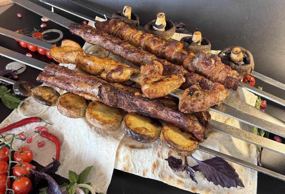 Свиная шея, баранина корейка, свиные рёбра, говядина люля, куриная грудка, курица гриль, картошка, грибы, 4 соуса на выбор